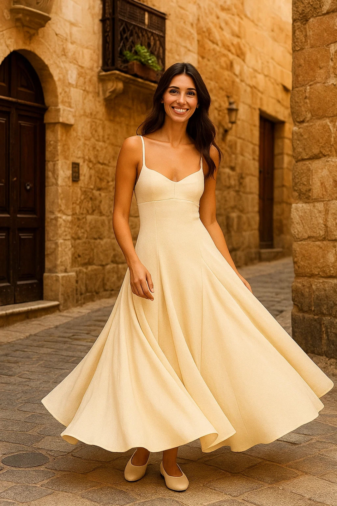 Questo abito color crema con spalline sottili e corpetto sagomato valorizza la figura in modo delicato. Il taglio fluido della gonna crea un movimento armonioso ad ogni passo. Perfetto per cerimonie, eventi serali o momenti indimenticabili.