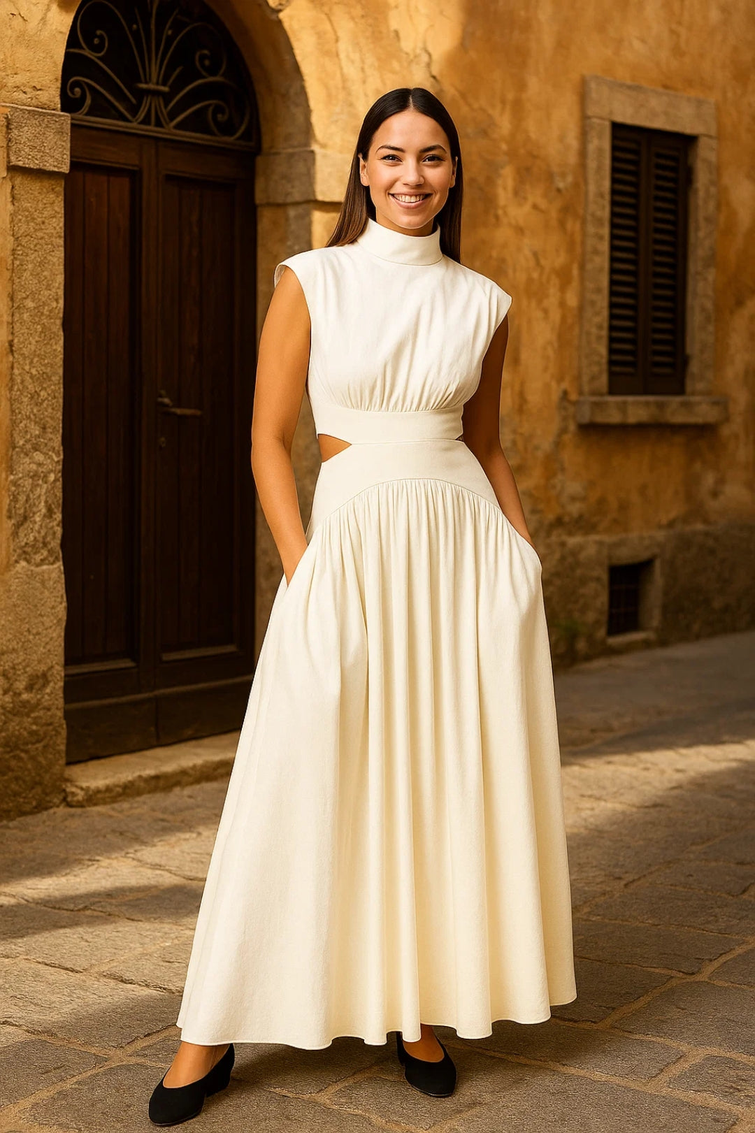 Questo abito lungo con collo alto e dettagli cut-out sui fianchi unisce raffinatezza e originalità. Il corpetto strutturato valorizza il busto, mentre la gonna ampia dona fluidità e movimento. Perfetto per cerimonie, eventi o serate estive.