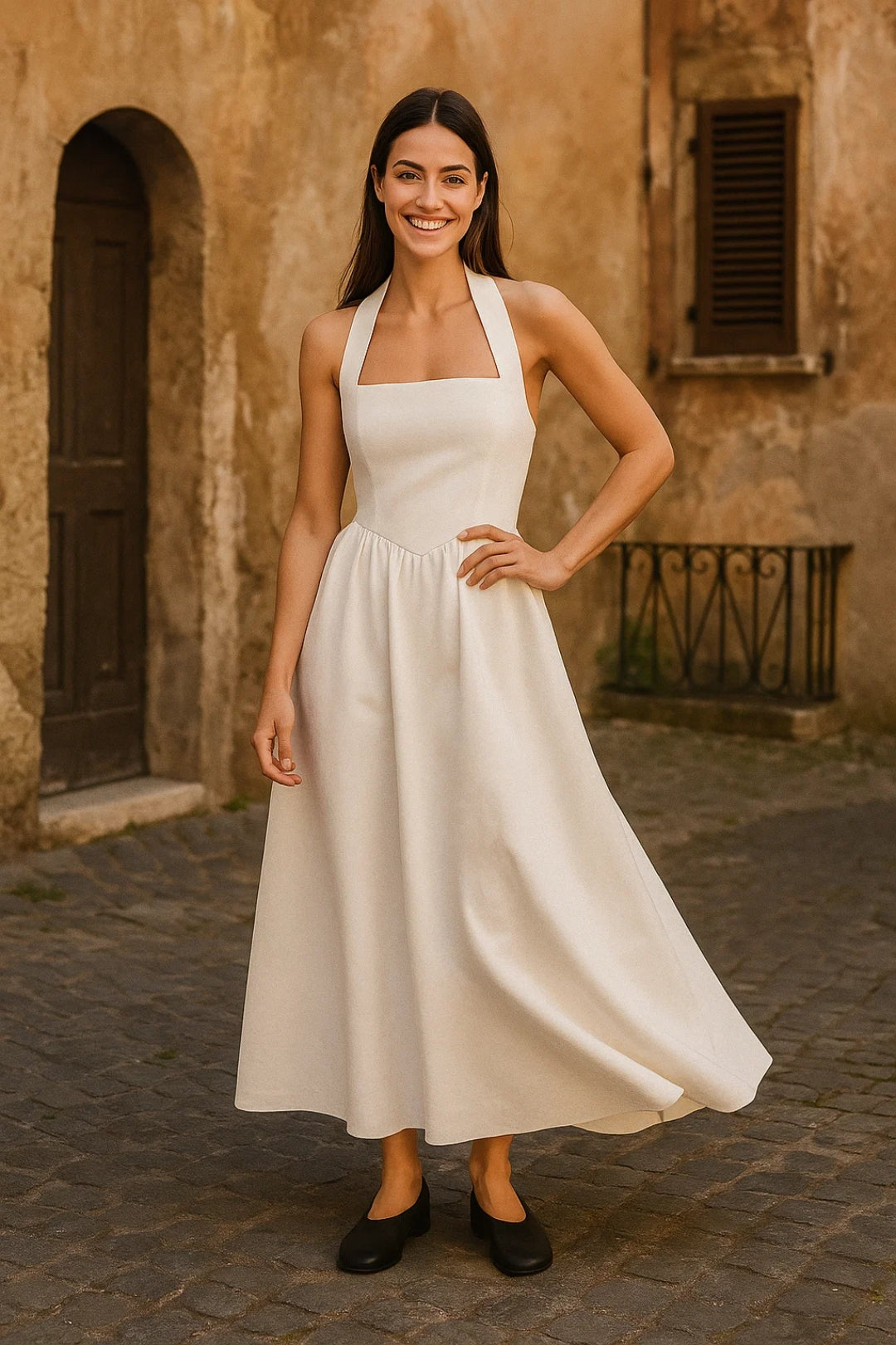 Questo abito lungo con scollo all'americana unisce semplicità e raffinatezza in un design senza tempo. La linea svasata valorizza la figura, mentre il corpetto strutturato dona un tocco di eleganza minimale. Ideale per eventi informali, vacanze o momenti di relax.