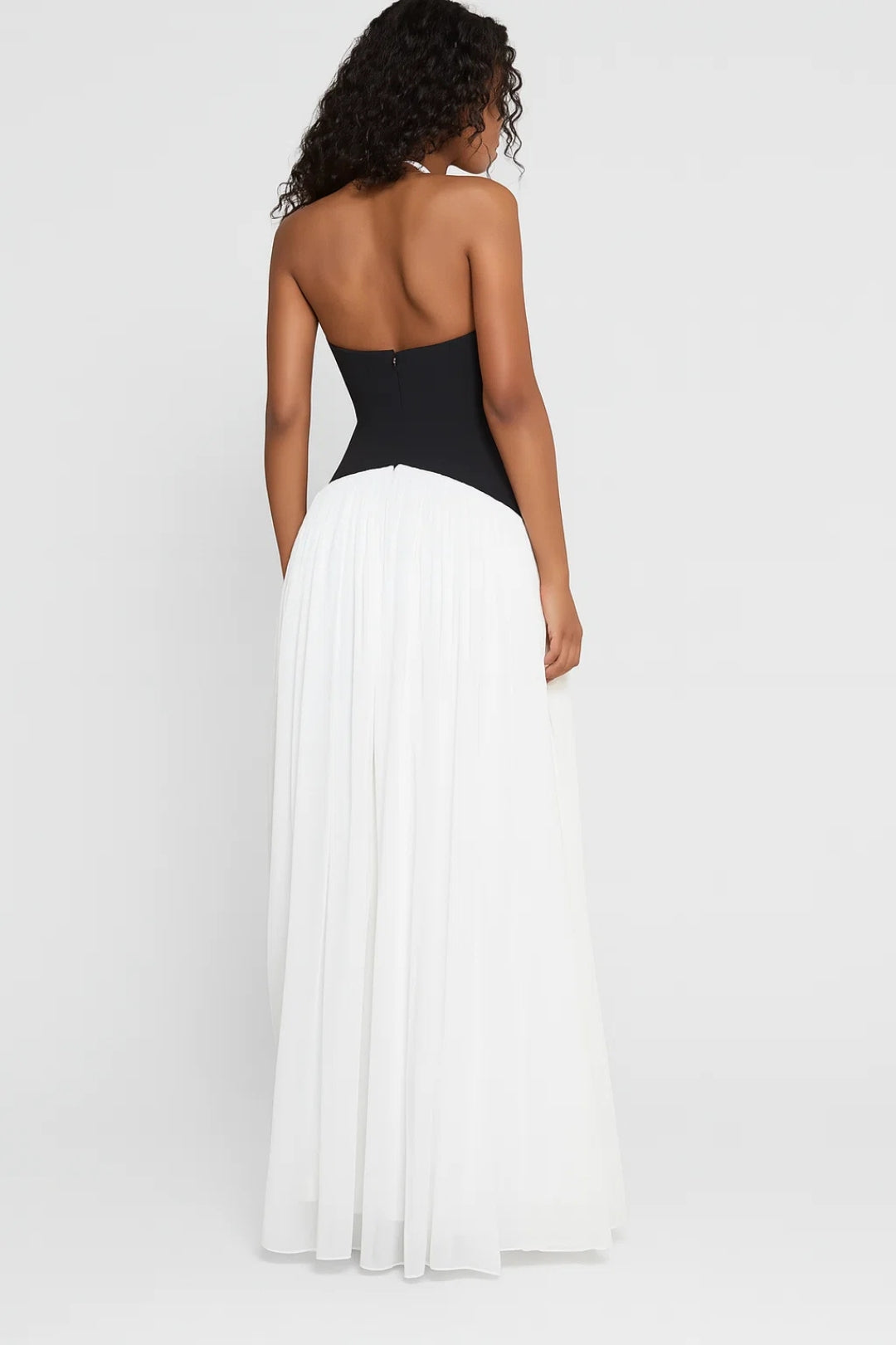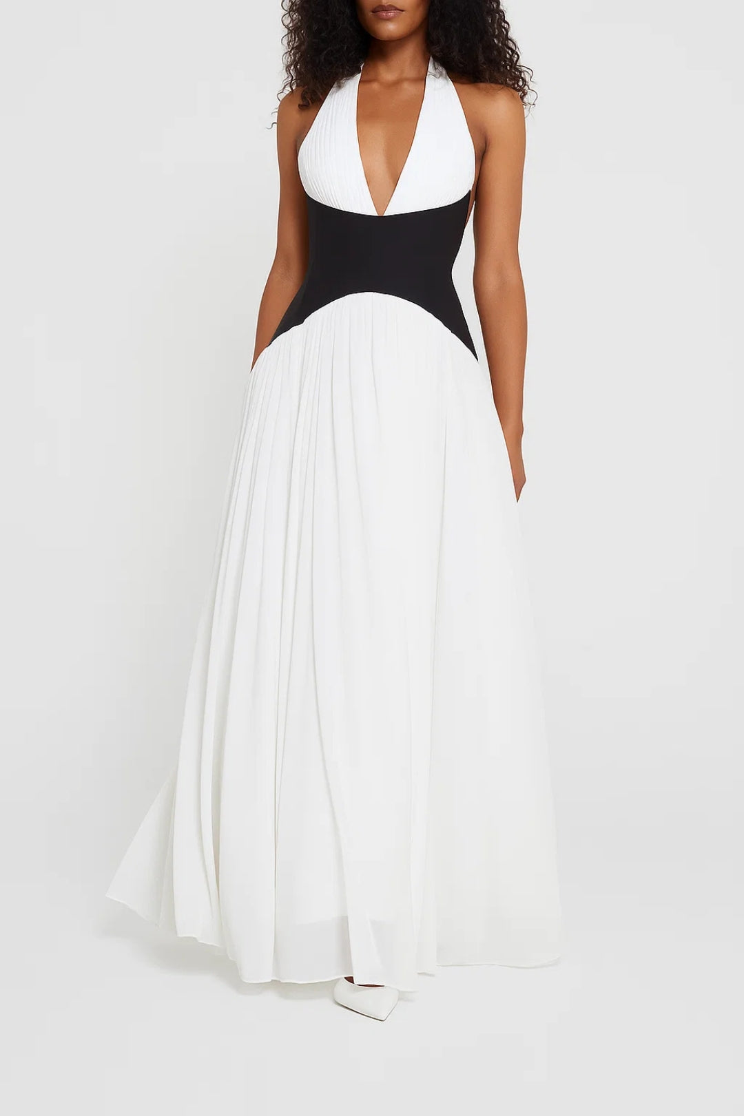 Questo abito lungo bicolore unisce un design sofisticato a un tocco moderno.