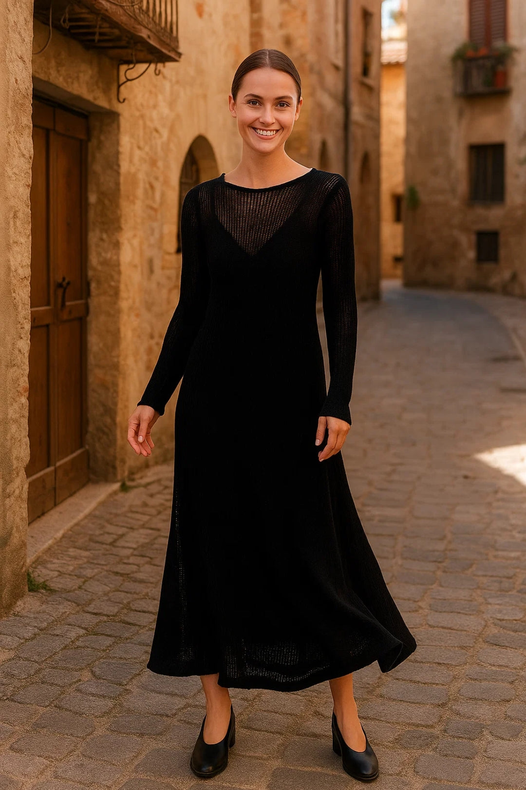 Abito lungo in maglia traforata nera | Maniche lunghe e scollo a V