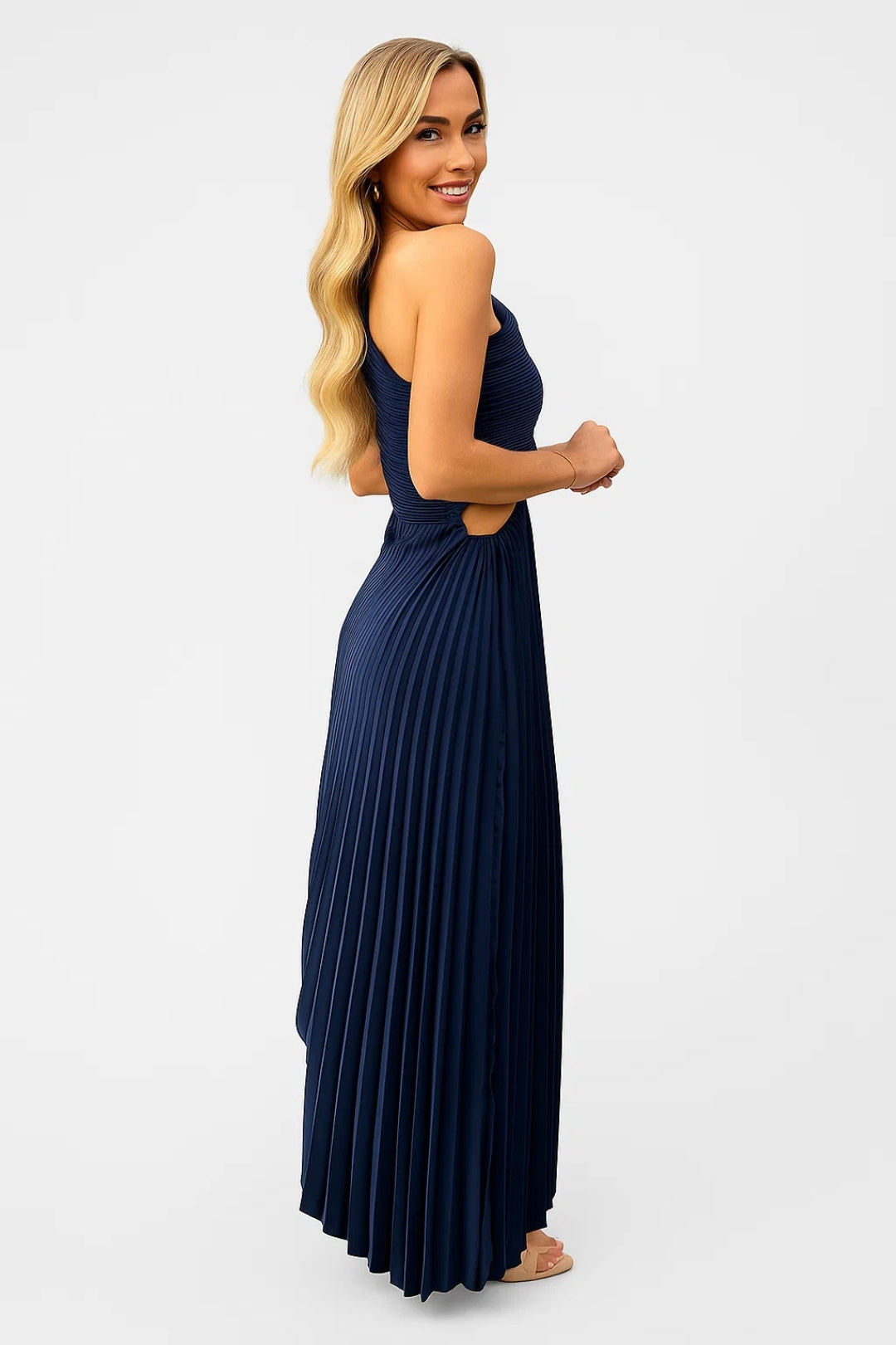 Questo abito lungo monospalla è una dichiarazione di stile. Il tessuto plissettato cade con grazia sul corpo, mentre il taglio asimmetrico sottolinea la silhouette in modo sofisticato. Ideale per eventi, cene o serate estive.
