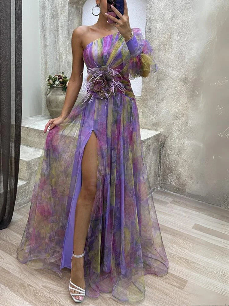 Abito Lungo Monospalla | Tulle Floreale | Leggero e Scenografico