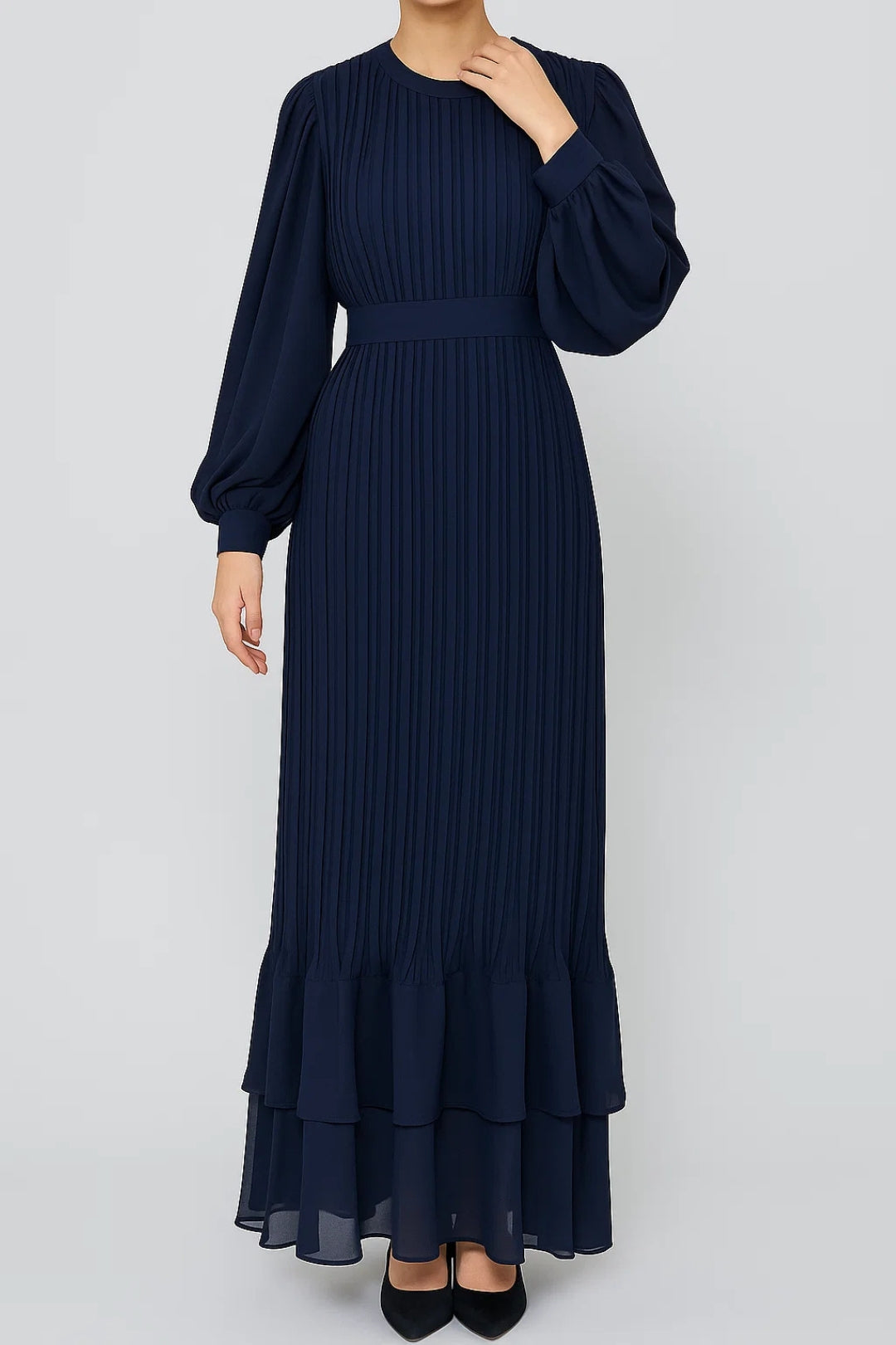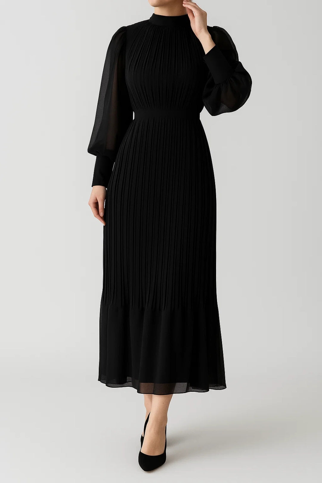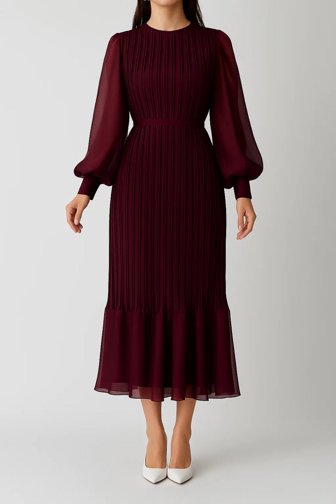 Abito lungo plissettato con maniche a palloncino | Elegante e fluido