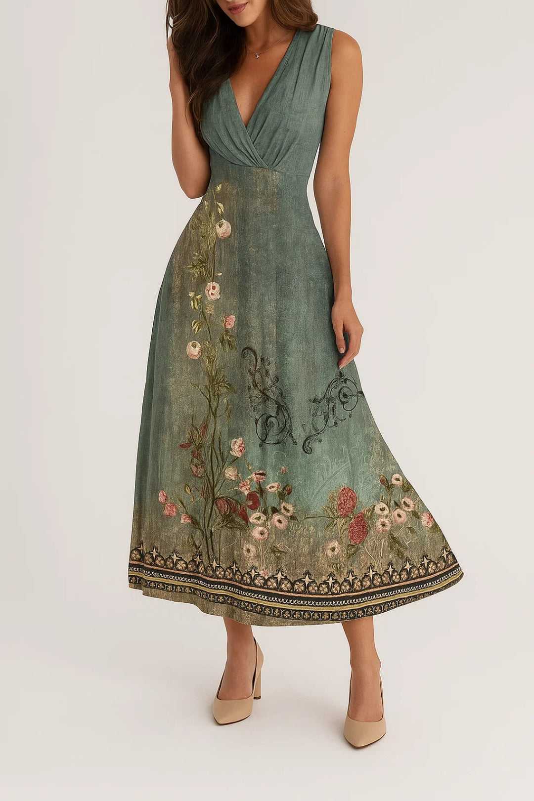 Abito lungo senza maniche con stampa floreale vintage | Scollo incrociato a V