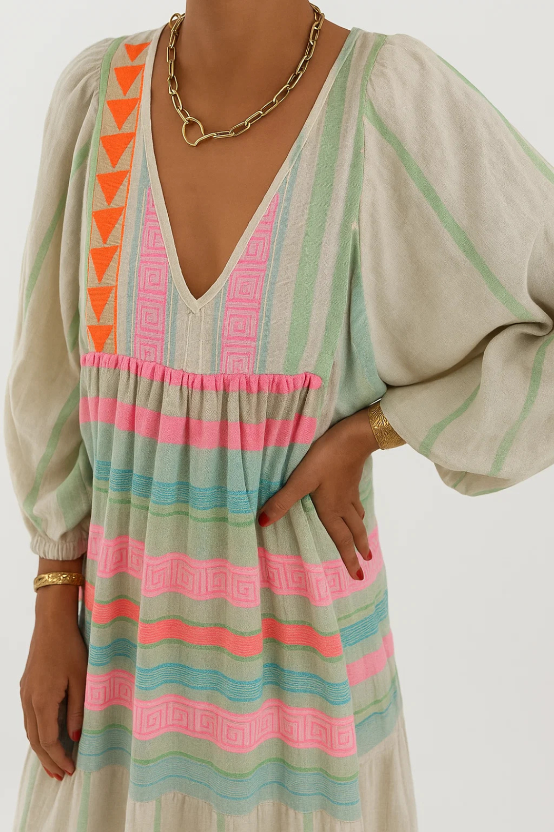 Questo abito maxi è realizzato in una fresca combinazione di cotone e lino, perfetta per le giornate calde. Le maniche a palloncino e la scollatura a V creano un look rilassato e femminile, mentre i motivi geometrici dai colori vivaci aggiungono un tocco gioioso e originale.