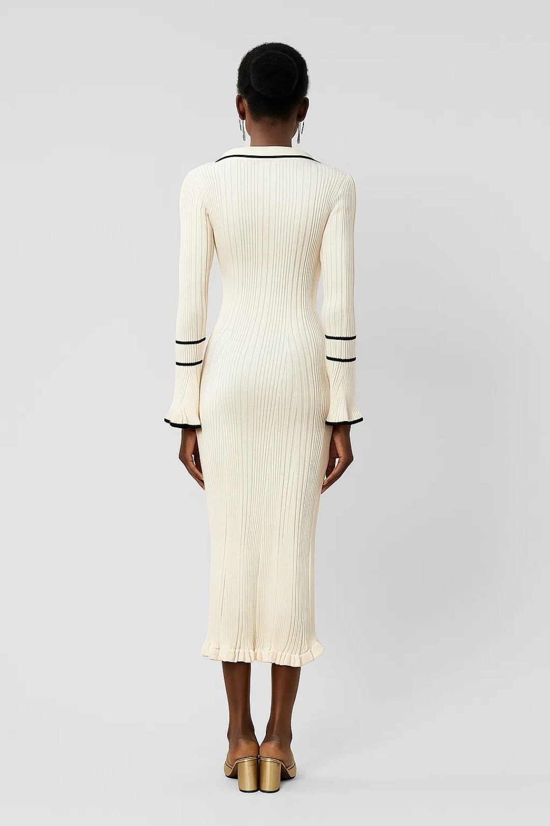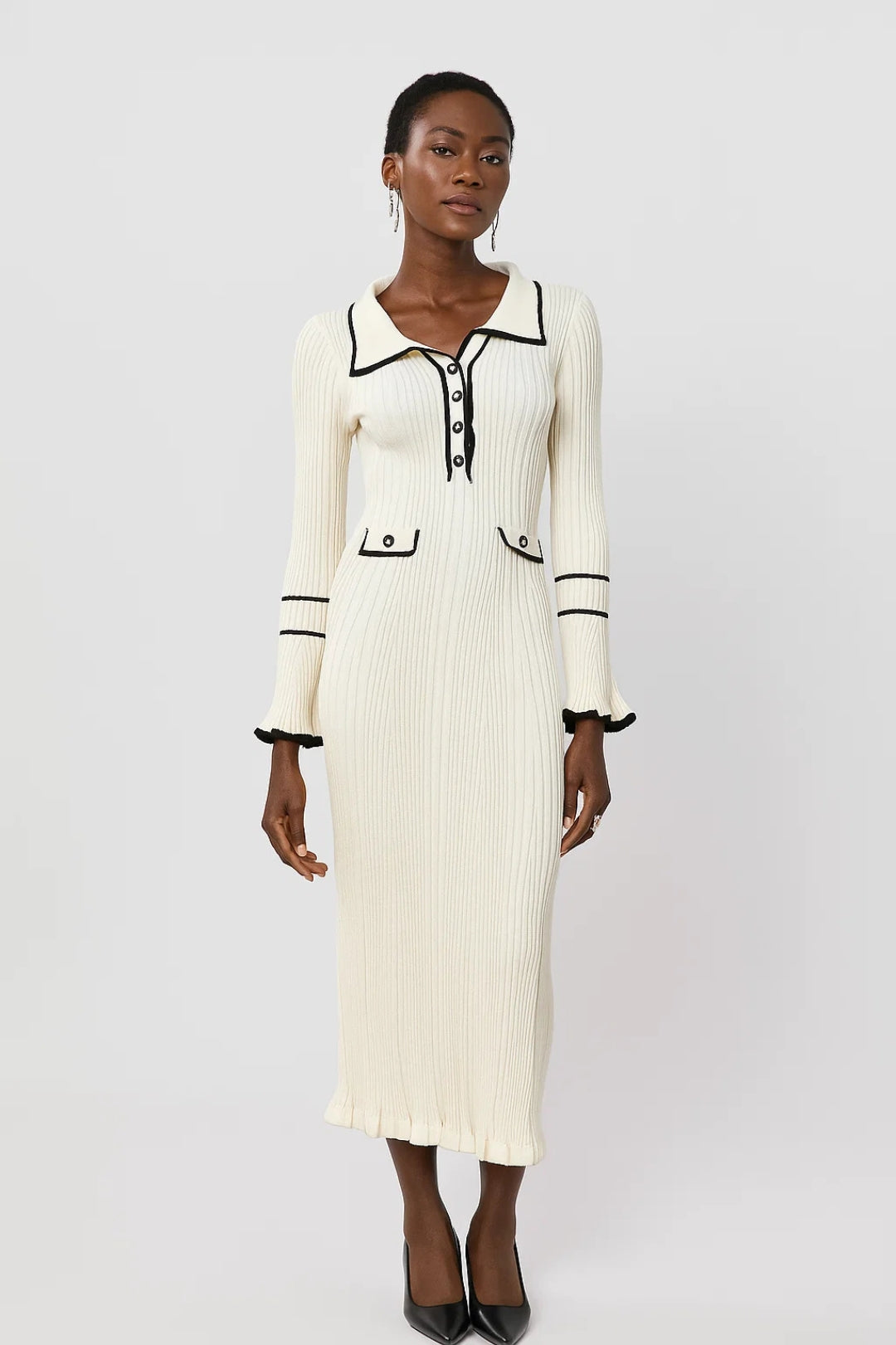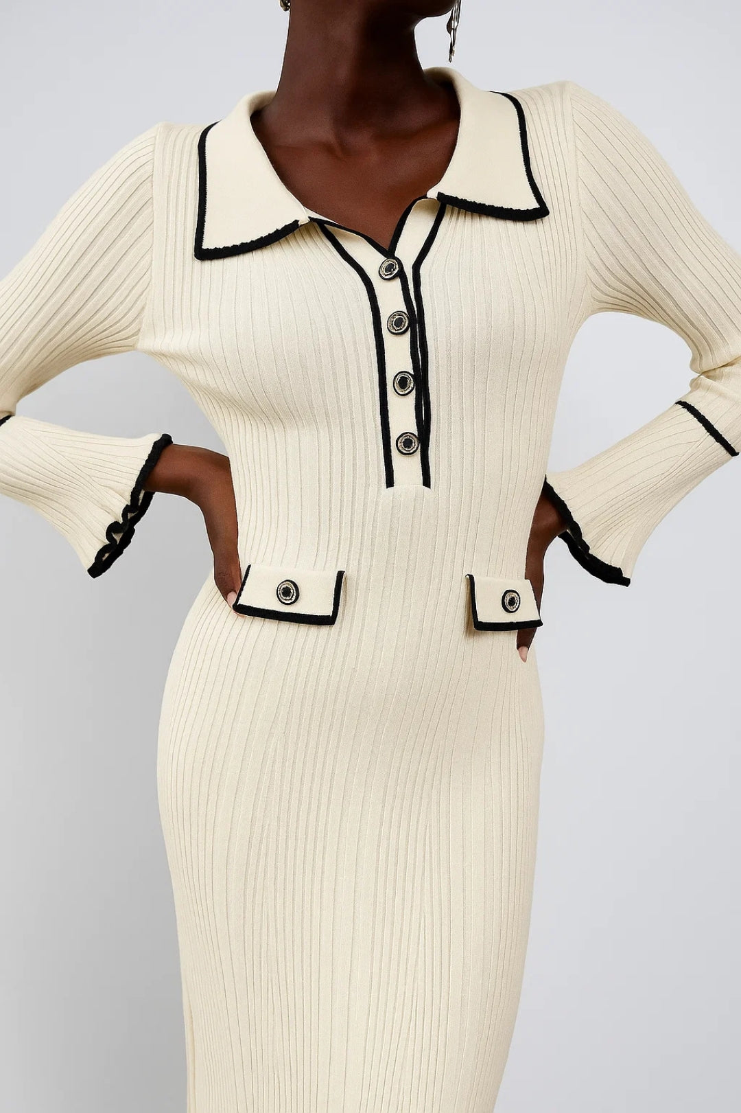 Abito midi a costine con colletto e dettagli a contrasto