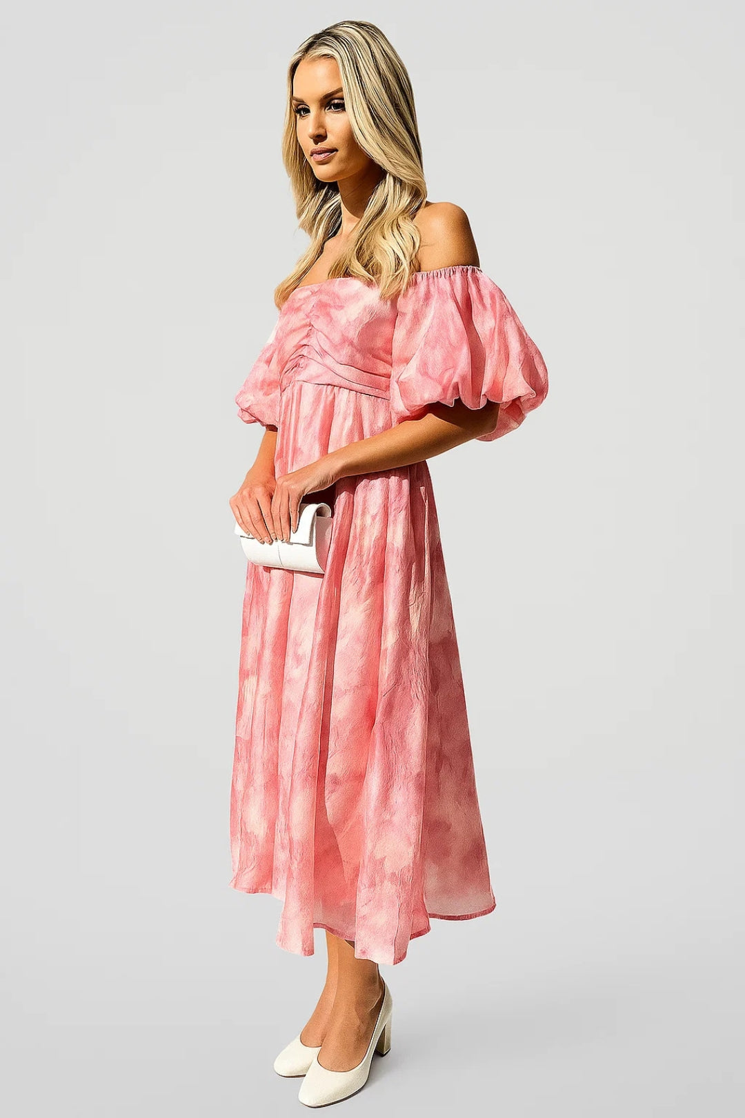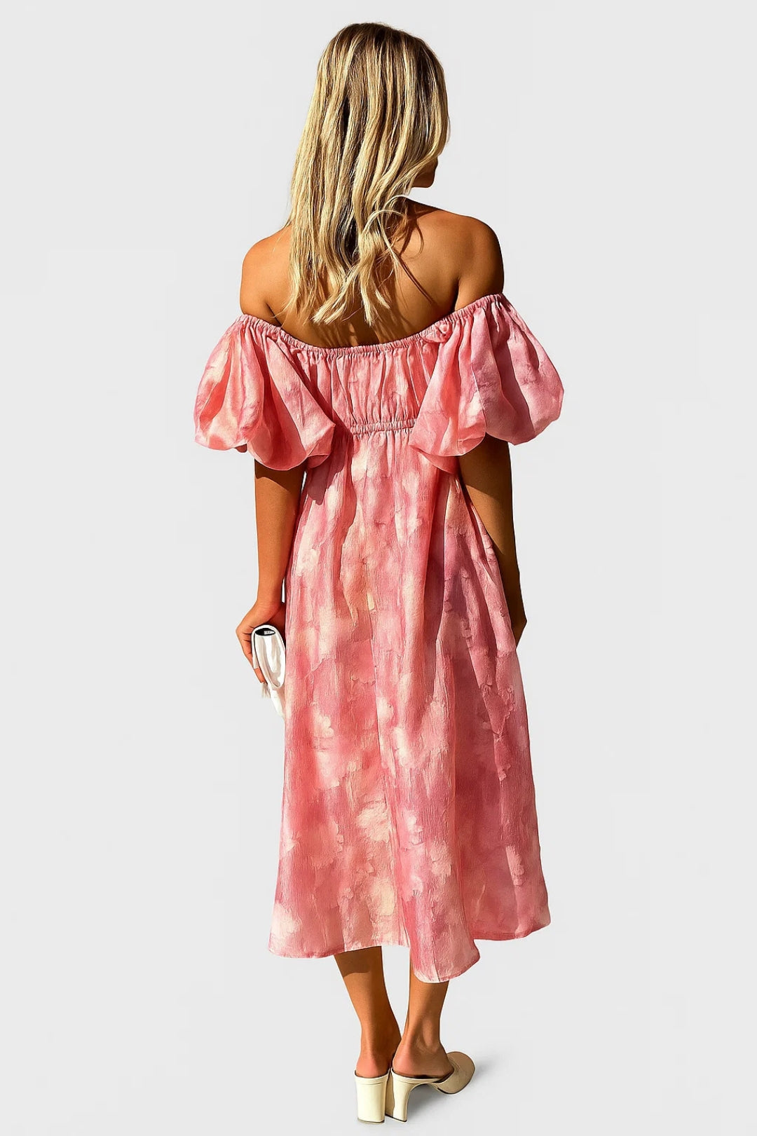 Questo abito midi con stampa acquerello rosa unisce romanticismo e freschezza in un design arioso. Le maniche a sbuffo e il taglio a spalle scoperte donano un tocco femminile irresistibile.