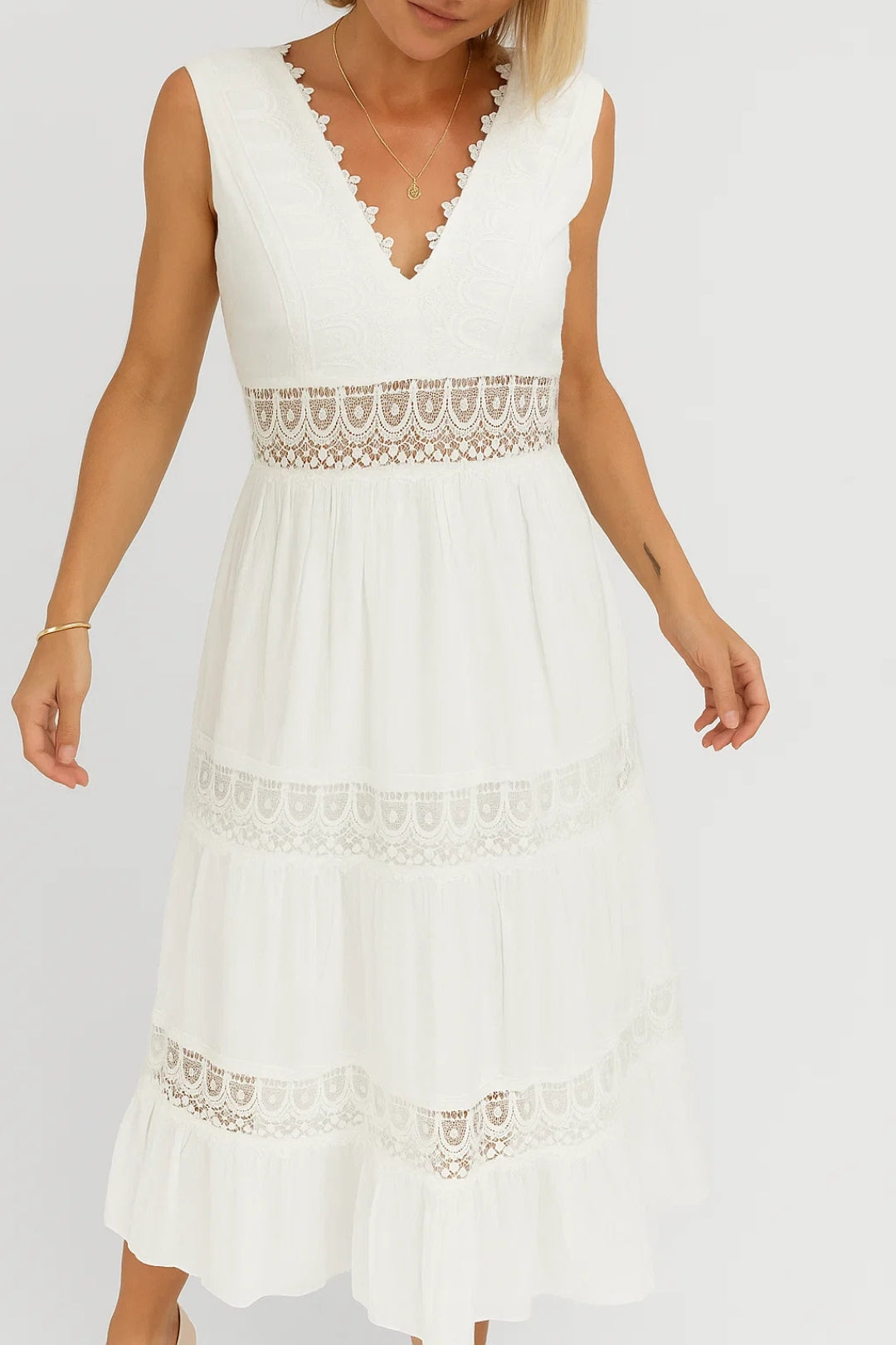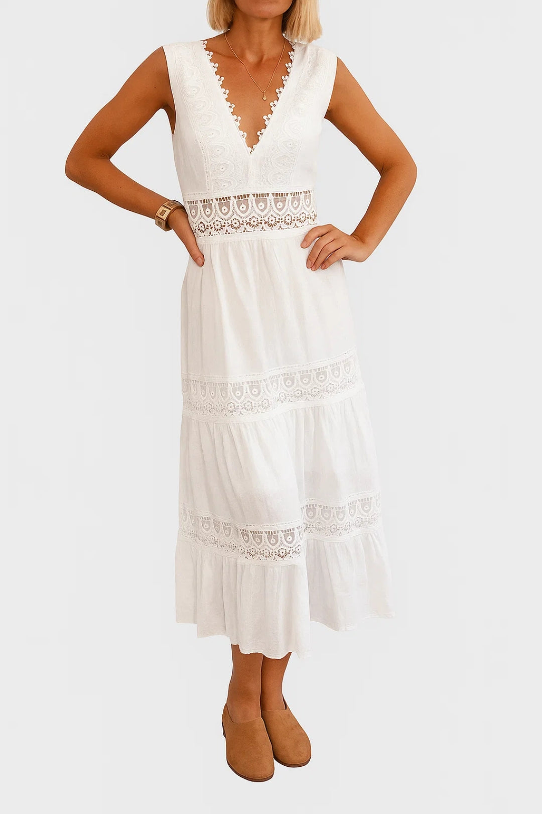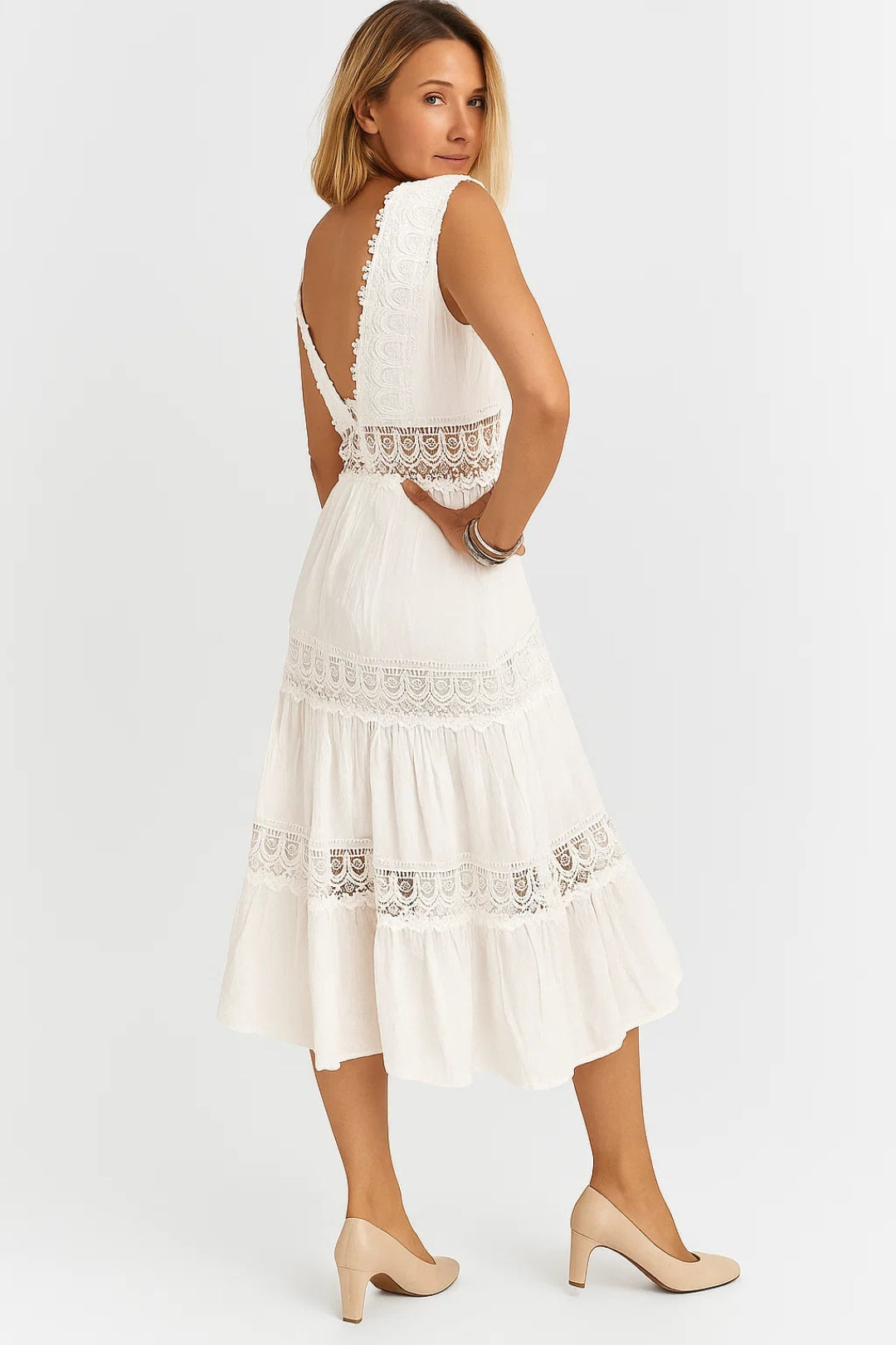 Questo abito midi con dettagli in pizzo traforato è l’ideale per creare un look femminile e naturale. Il taglio svasato e lo scollo profondo valorizzano la figura, mentre i ricami aggiungono un tocco boho chic perfetto per le vacanze o un aperitivo all’aperto.