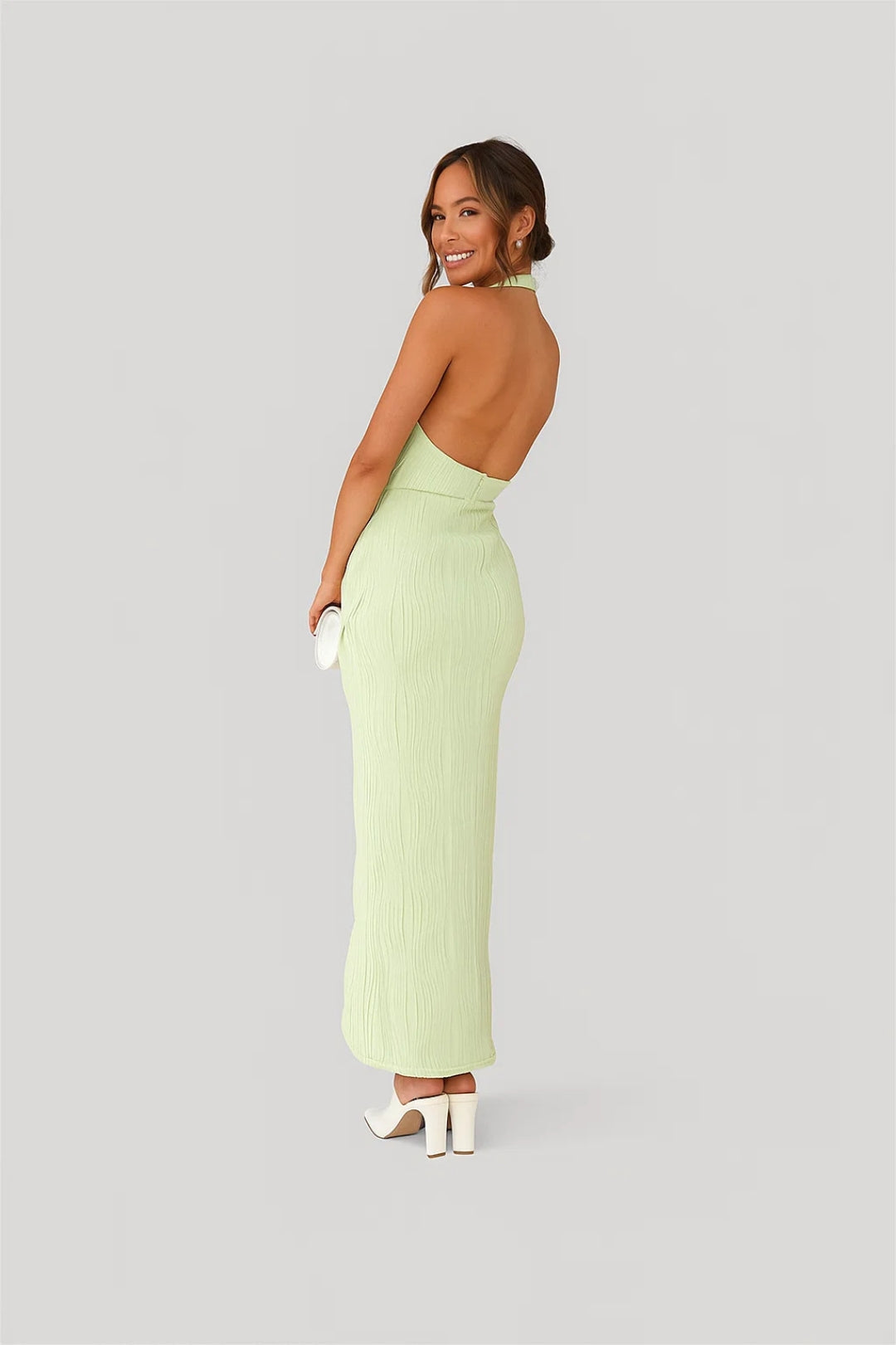 La schiena scoperta aggiunge un tocco sensuale, mentre il tessuto leggero valorizza ogni movimento.