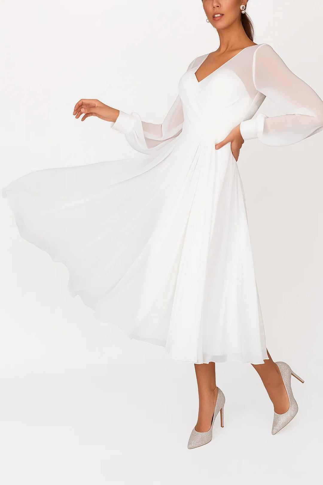 Questo abito midi in tessuto fluido unisce eleganza classica e comfort moderno. Il corpetto con scollo a V incrociato e le maniche lunghe in chiffon trasparente donano un tocco etereo e femminile. Perfetto per cerimonie, eventi formali o un look da invitata impeccabile.