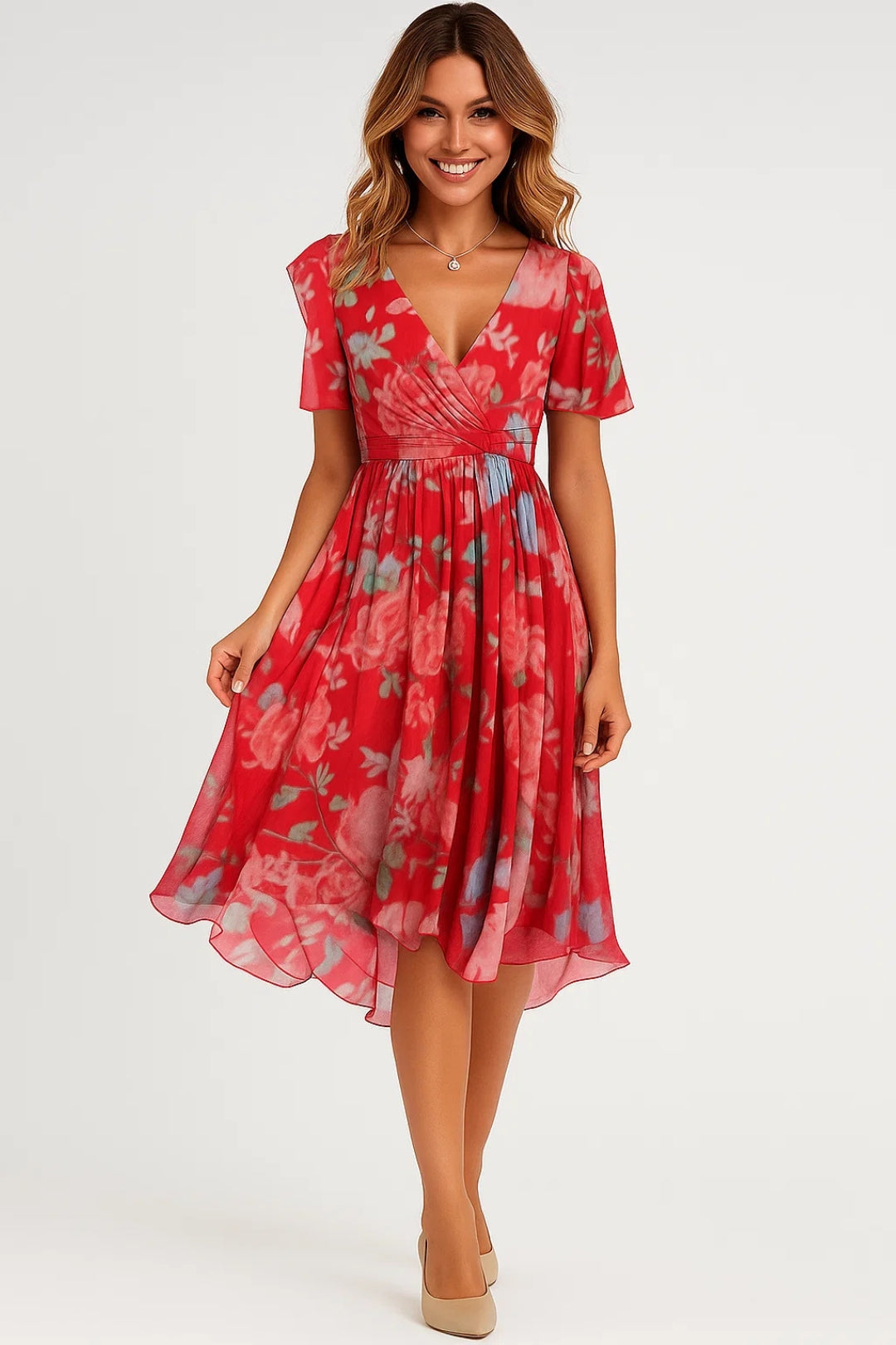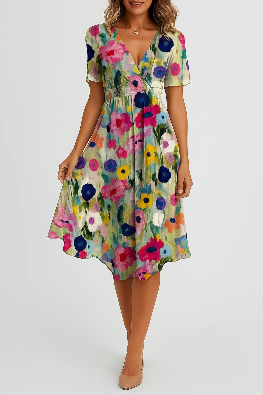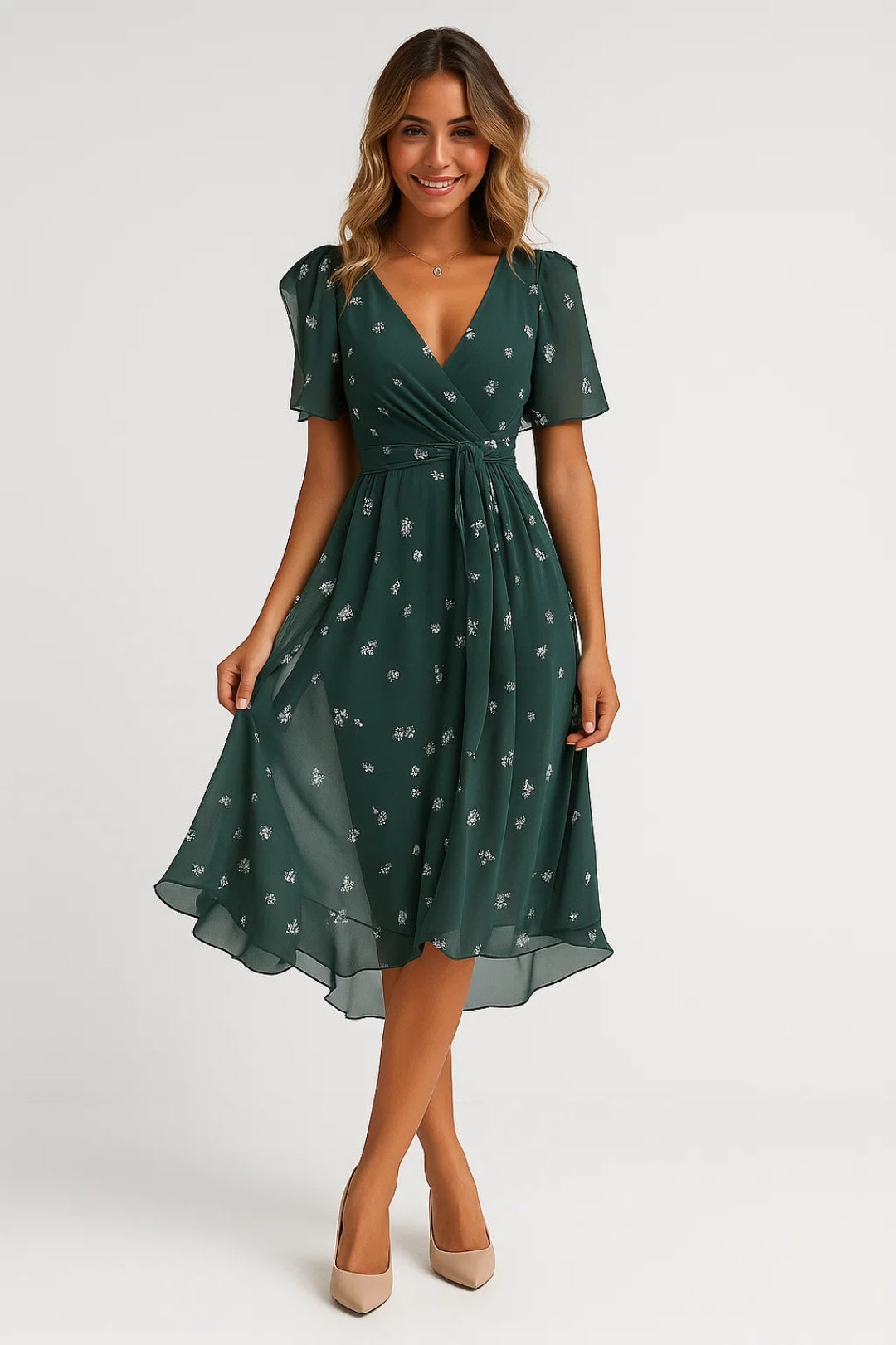 Abito midi leggero con scollo a V e maniche corte svolazzanti