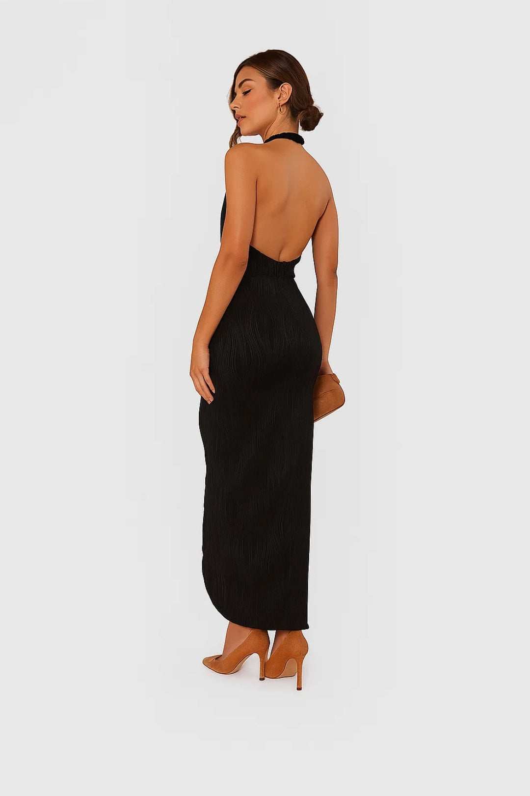 Questo abito midi con collo halter e tessuto plissé avvolge la figura con raffinatezza.