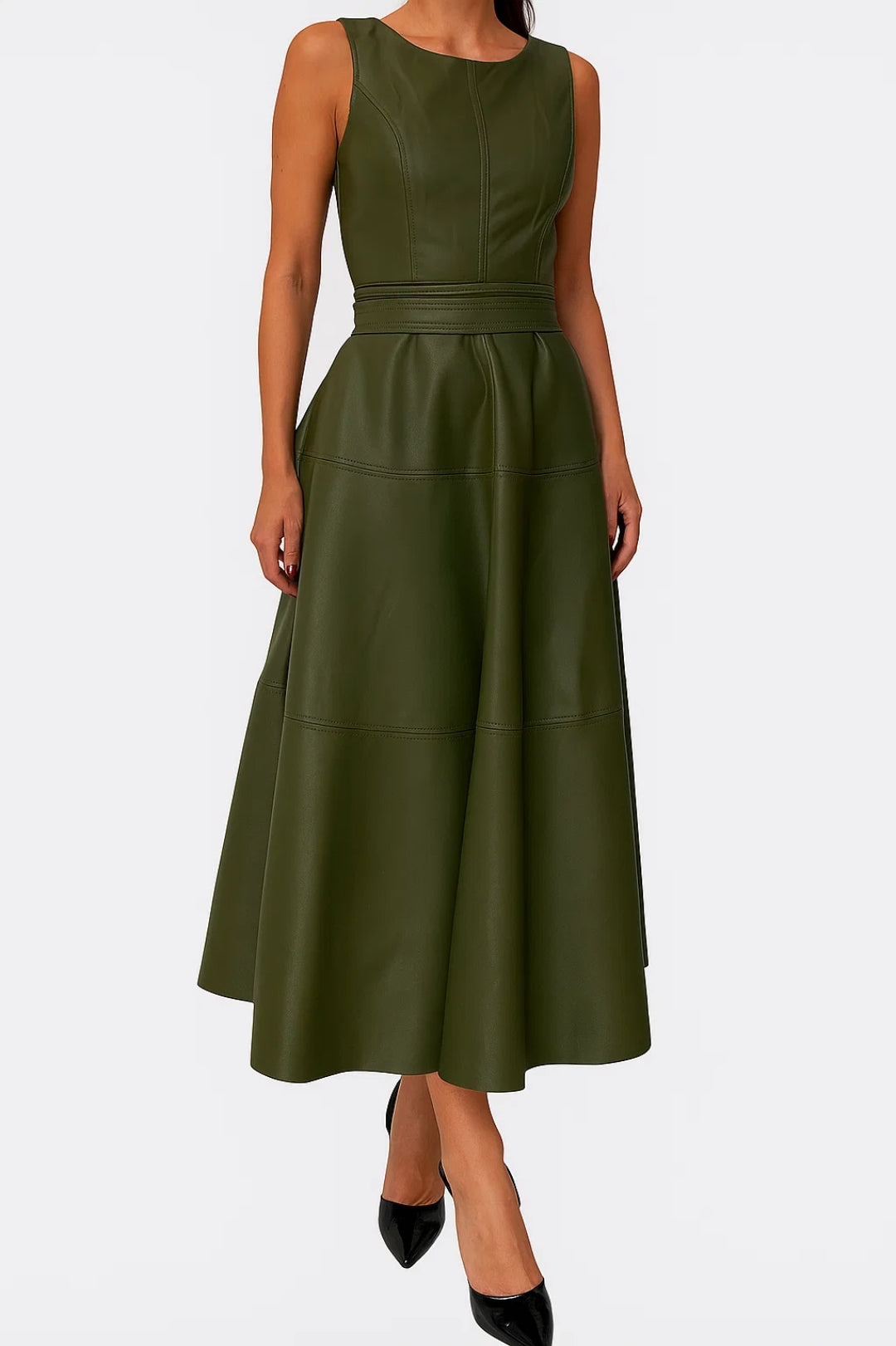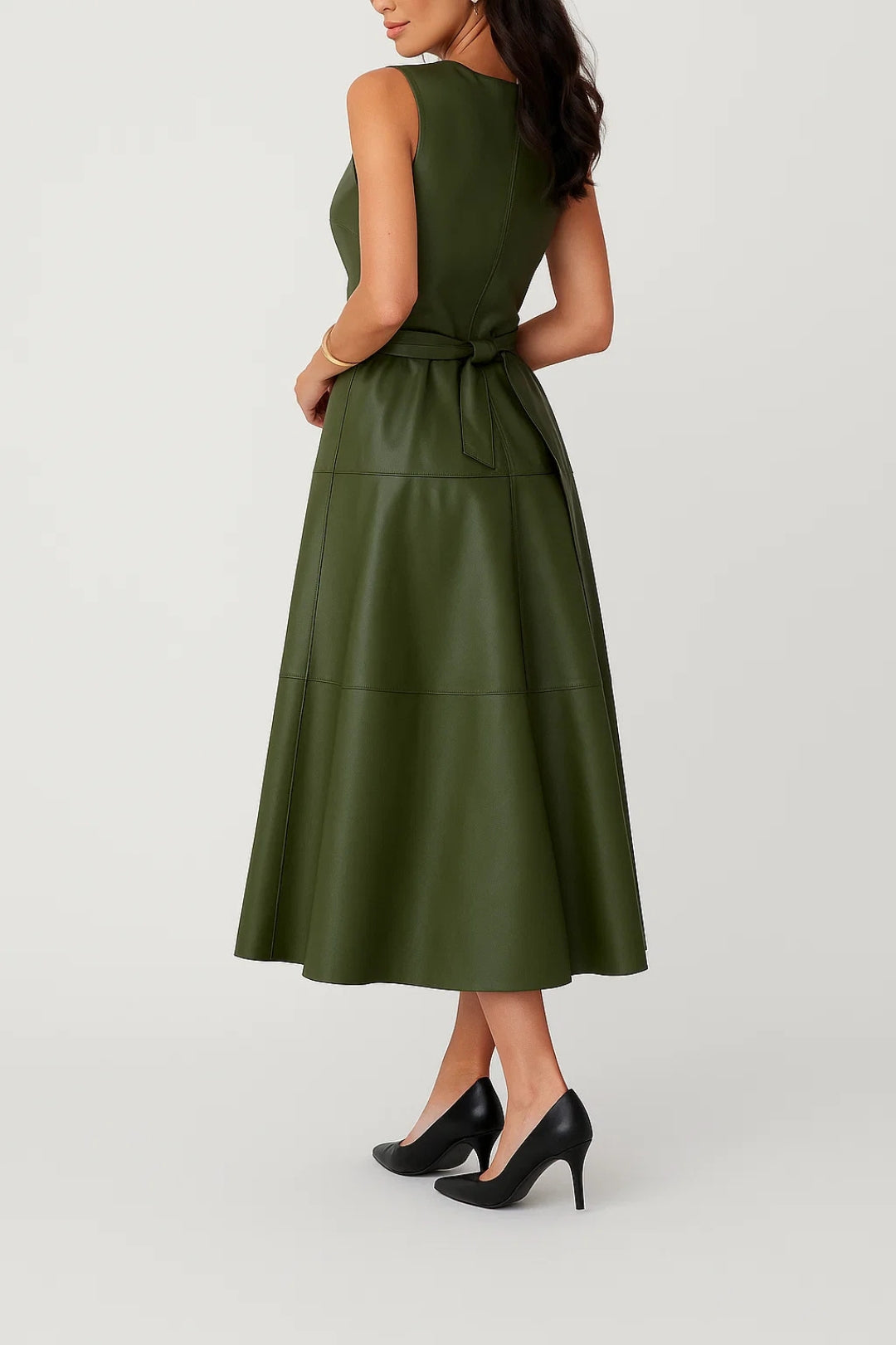 Abito midi senza maniche in similpelle | Verde oliva elegante