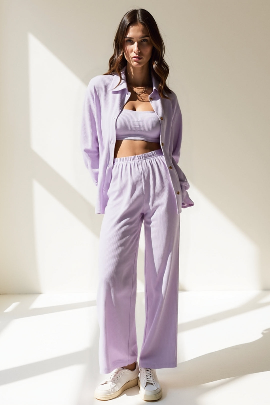 Questo set, composto da camicia a maniche lunghe e pantaloni ampi a vita alta, è realizzato in tessuto morbido e leggero per offrirti comfort e stile in ogni occasione.