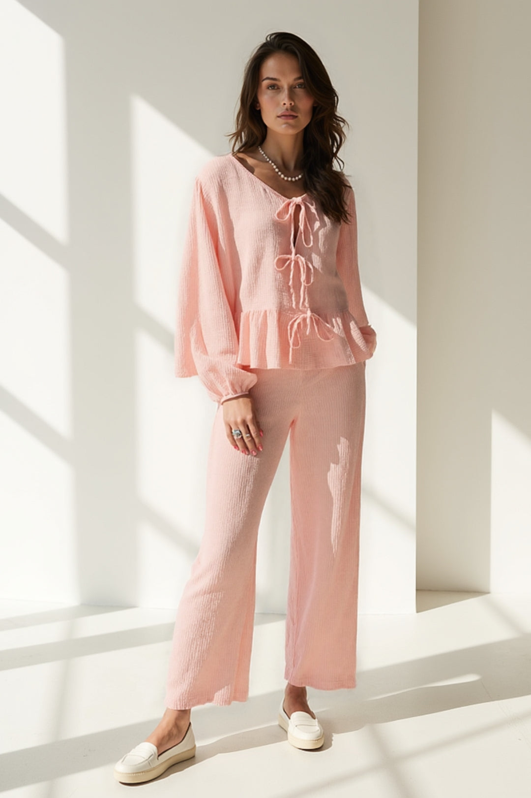 Questo set due pezzi con blusa arricciata e pantaloni a gamba dritta è perfetto per un look femminile e leggero.