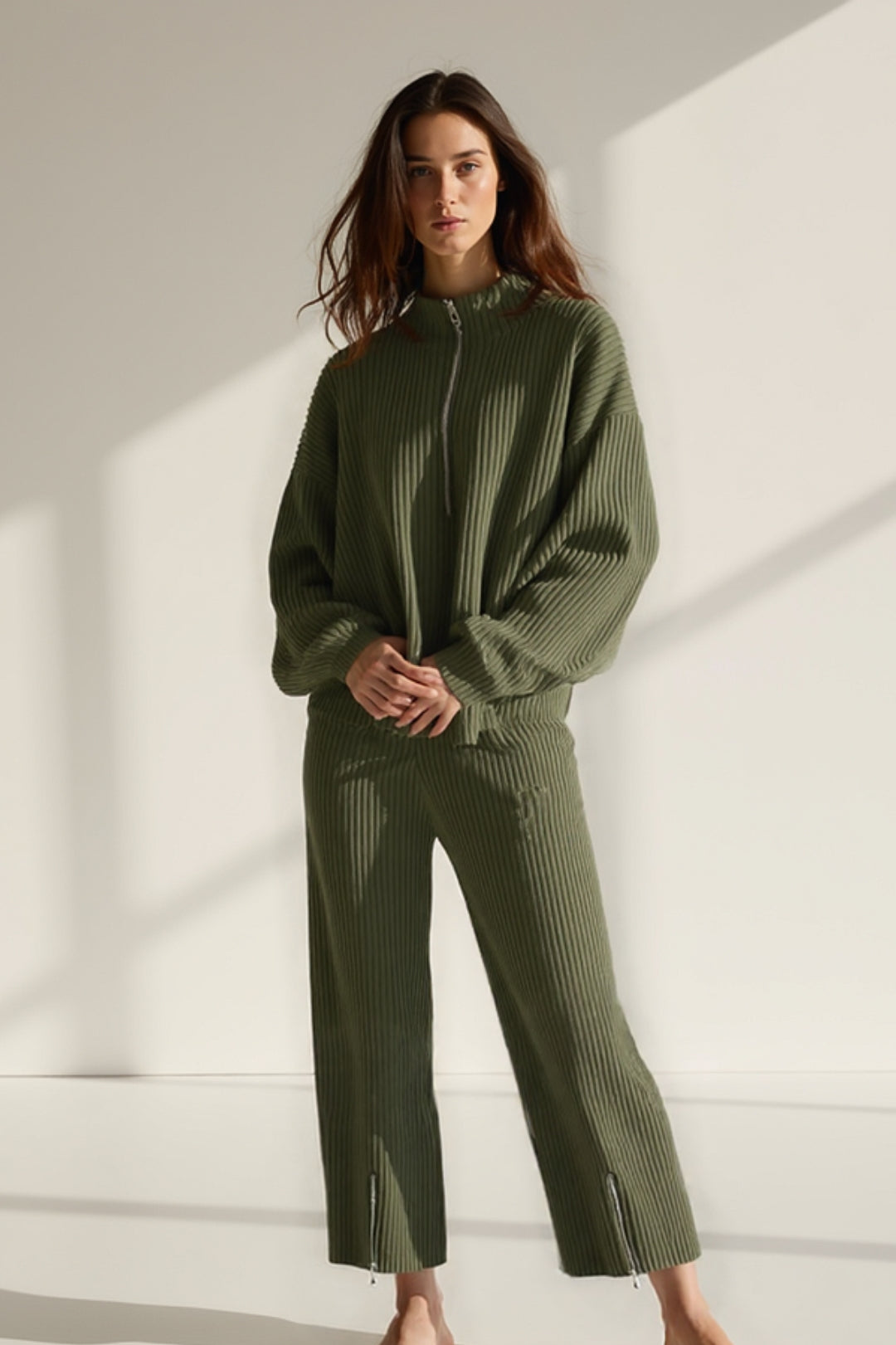 Cerchi un completo comodo ma elegante per il tempo libero o le giornate casual? Questo set a due pezzi in maglia a costine, composto da felpa con zip frontale e pantaloni coordinati, unisce stile rilassato e dettagli moderni. Il tessuto morbido e il taglio ampio garantiscono comfort e libertà di movimento.