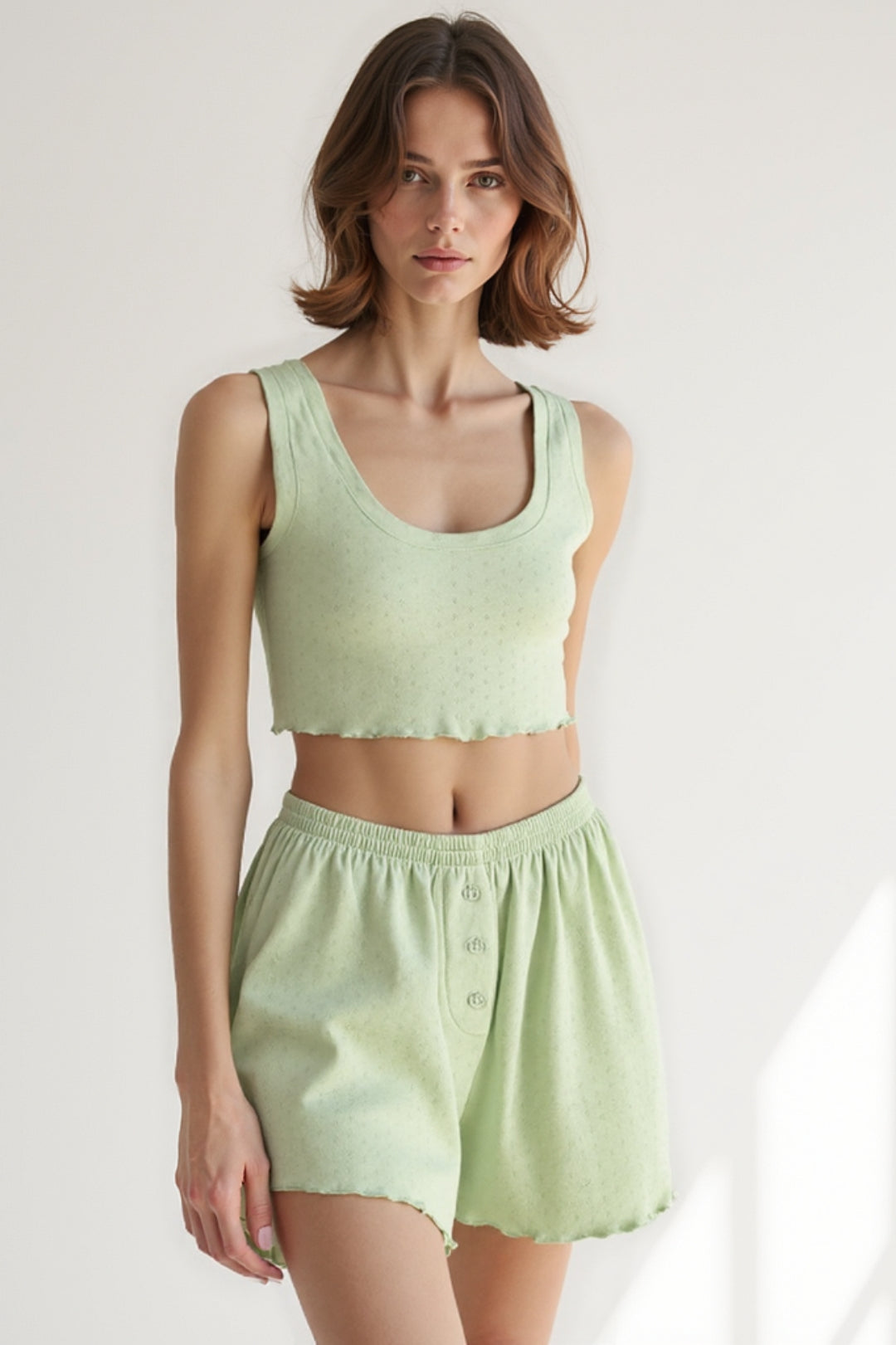 Completo rilassato con top corto e pantaloncini con bottoni