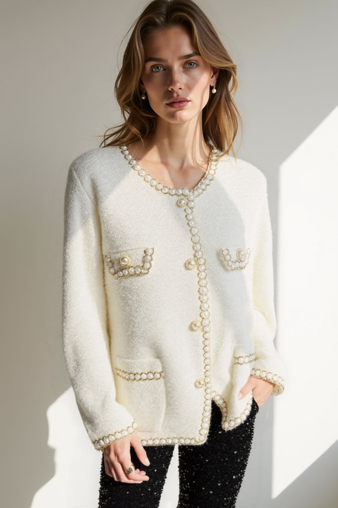 Questa giacca in bouclé con dettagli gioiello è la scelta perfetta per un look sofisticato e femminile. I bordi decorati e i bottoni perlati aggiungono un tocco di lusso discreto. Perfetta da indossare con pantaloni eleganti o gonne midi per un evento serale.