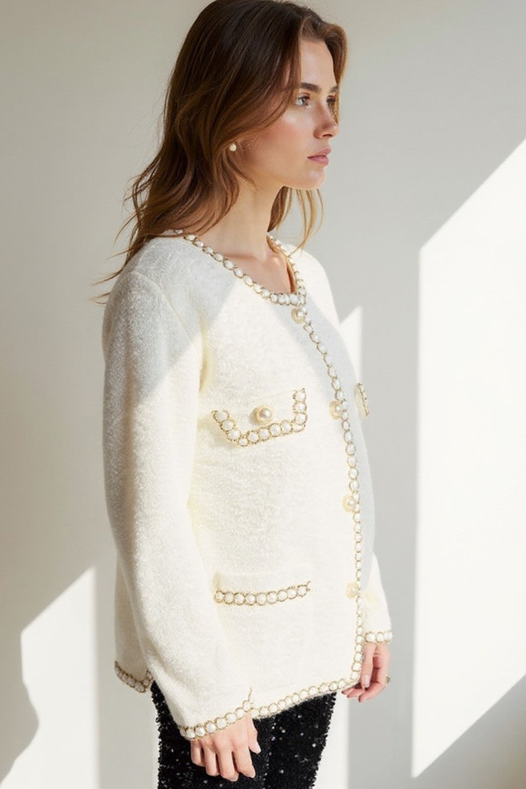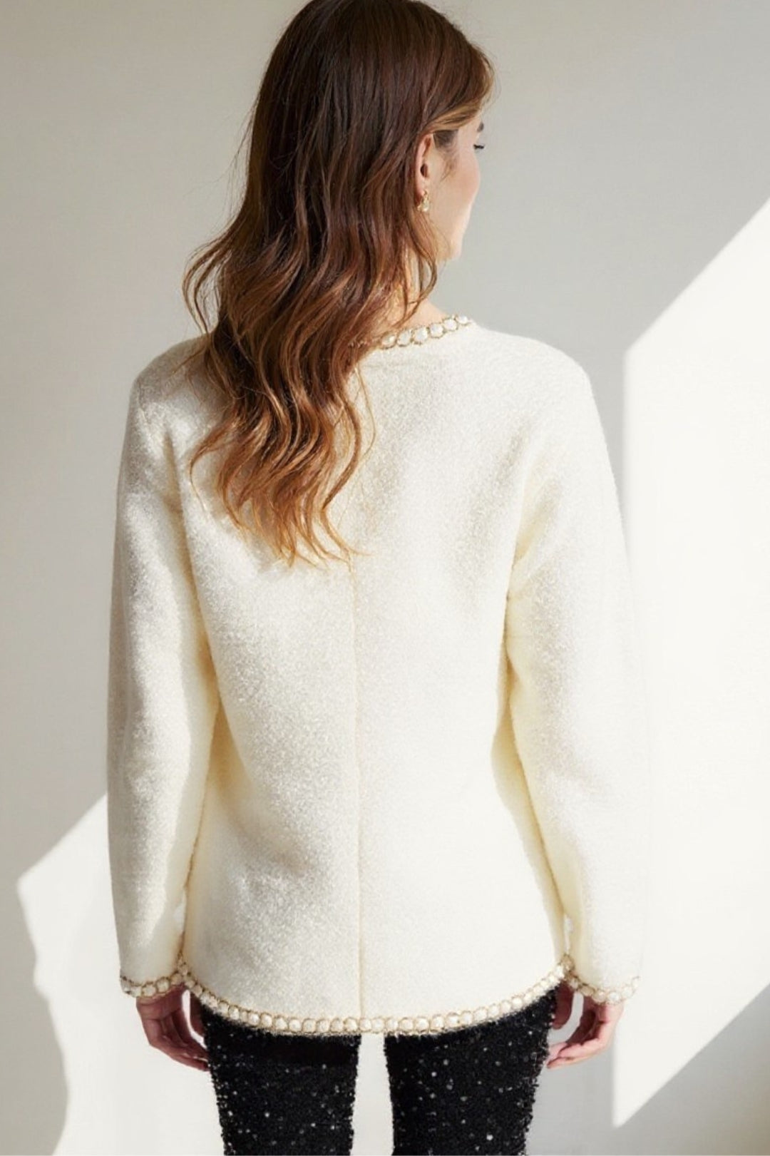 Giacca elegante in bouclé con dettagli gioiello | Chiusura con bottoni perlati