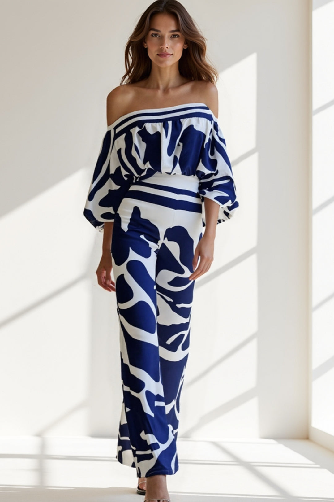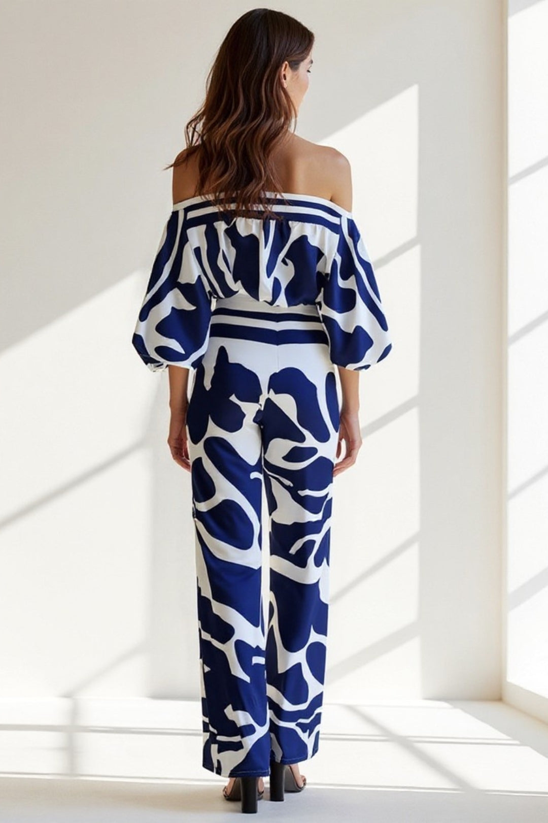 Questa tuta a spalle scoperte è la scelta perfetta per chi ama distinguersi con stile. Il motivo astratto in blu e bianco crea un effetto visivo unico, mentre la linea fluida valorizza la silhouette. Ideale per un aperitivo al tramonto o una serata in vacanza.