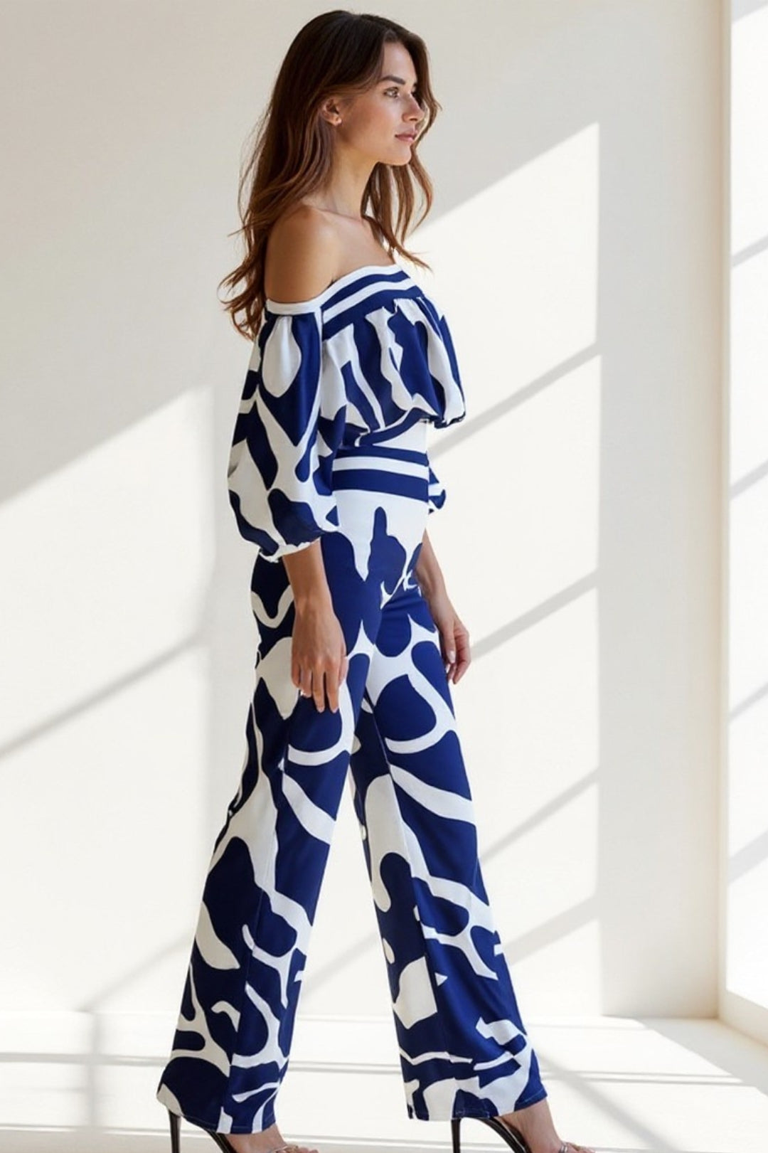 Tuta elegante a fantasia astratta | Spalle scoperte | Maniche ampie