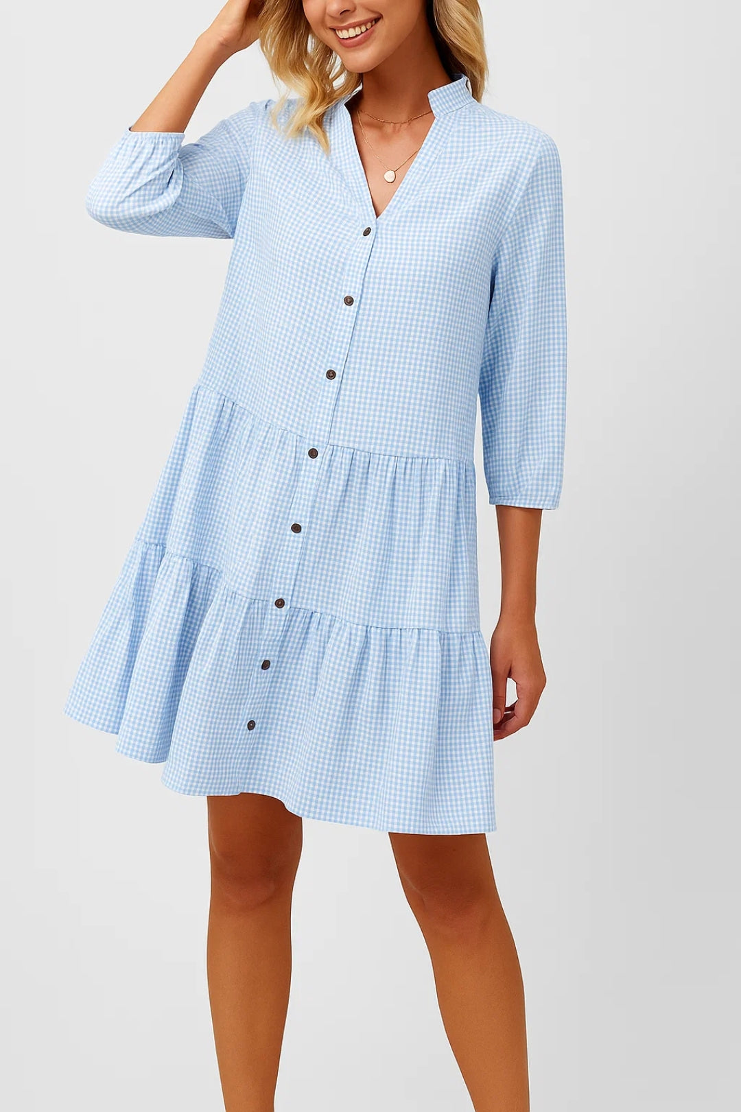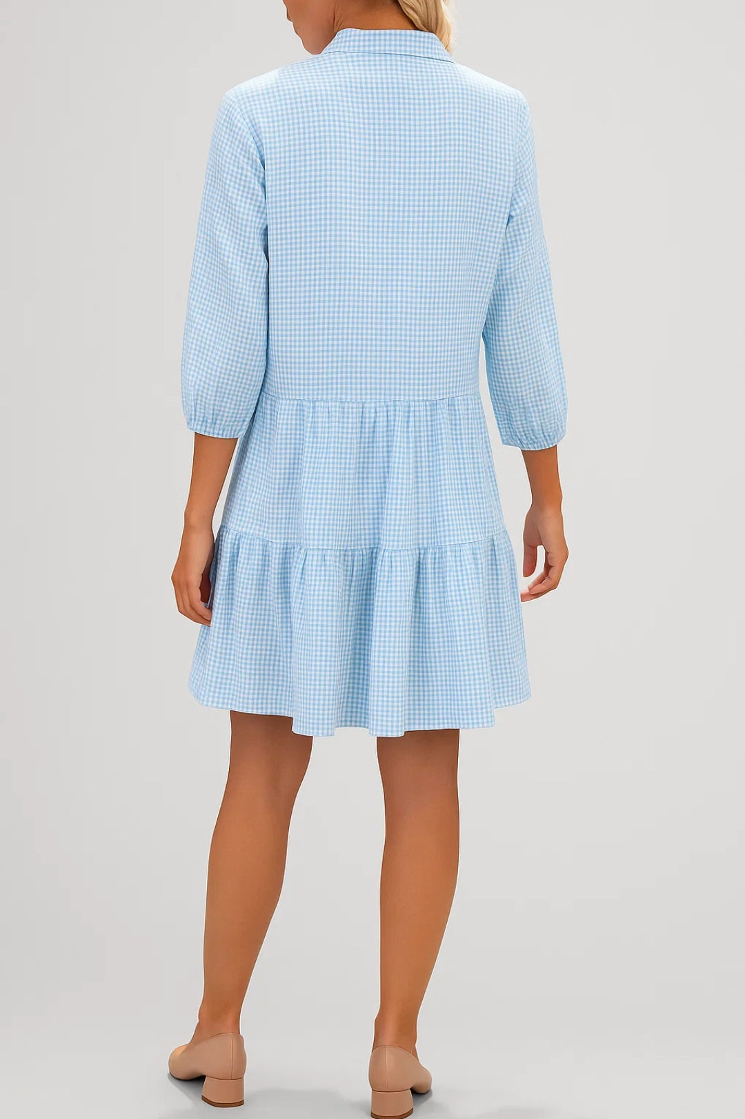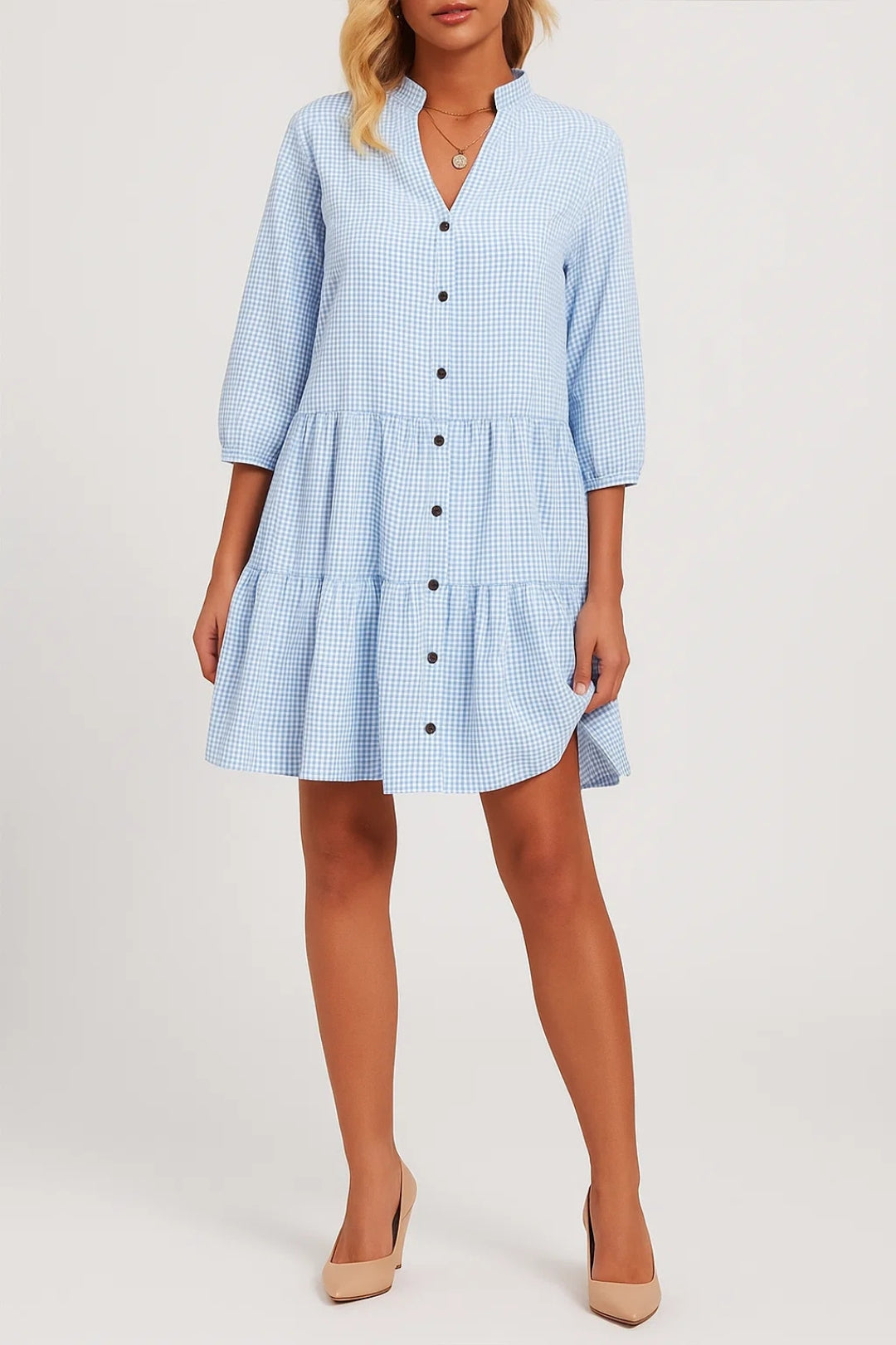 Questo vestito corto a quadretti è perfetto per un look fresco e disinvolto. Le maniche a tre quarti e la chiusura frontale con bottoni lo rendono pratico e versatile, mentre il taglio a balze dona movimento e leggerezza. Ideale per uscite informali o momenti di relax.