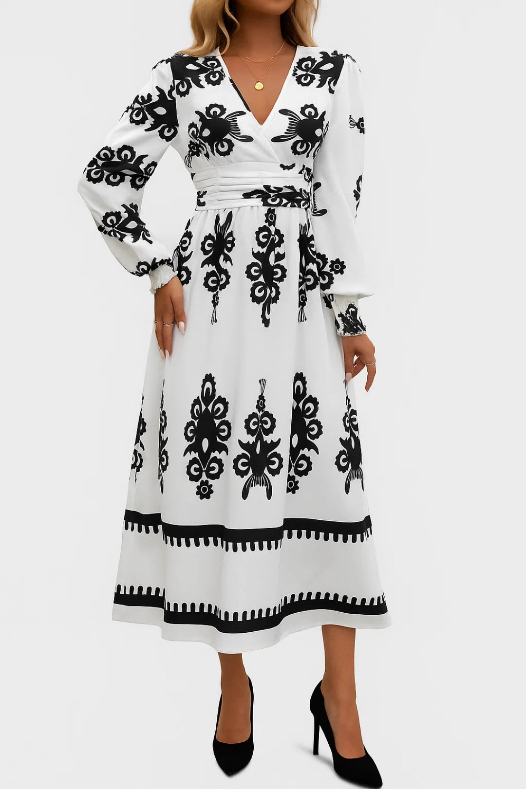 Vestito midi con stampa geometrica | Scollo a portafoglio e maniche lunghe